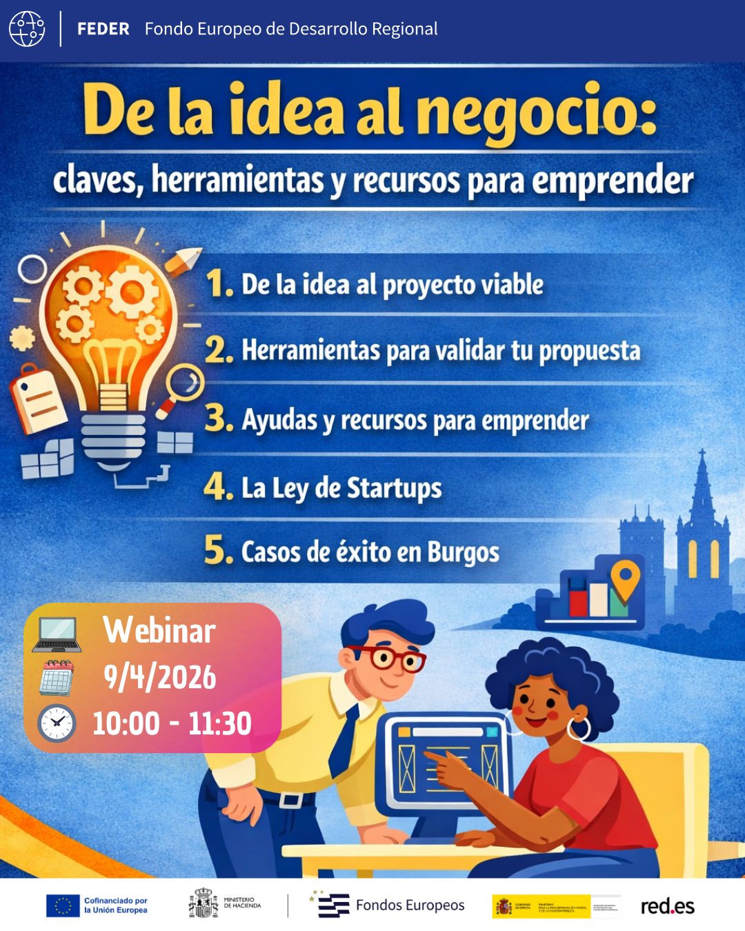 🛠️ A lo largo de la sesión abordaremos los primeros pasos para emprender, las herramientas que pueden ayudarte a ordenar, analizar y dar forma a tu propuesta, los apoyos y ayudas disponibles, y también algunos aspectos clave de la Ley de Startups que conviene conocer si estás pensando en poner en marcha un proyecto.